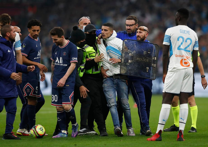 Þá hljóp áhorfandi inn á völlinn í seinni hálfleik og komst í snertingu við Lionel Messi (sem á enn eftir að skora deildarmark í Frakklandi).