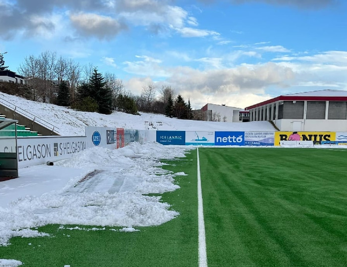 Ekki er búið að virkja hitakerfi undir vellinum og fram kemur á Vísi að engin snjókoma sé í kortunum fram að leik svo völlurinn er klár fyrir heimsókn Árbæinga.
