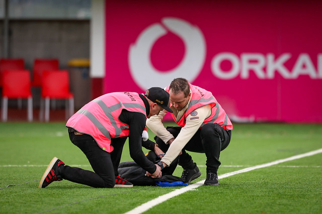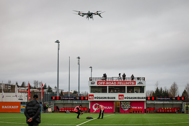 Fyrir leik mætti Skjöldurinn í Fossvoginn úr Kópavoginum á flugi með dróna og lenti á miðjum vellinum.