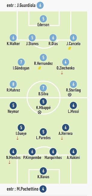 Franska blaðið L'Equipe gefur Lionel Messi falleinkunn fyrir frammistöðu hans í 2-1 tapi Paris Saint-Germain gegn Manchester City í Meistaradeildinni í gær.