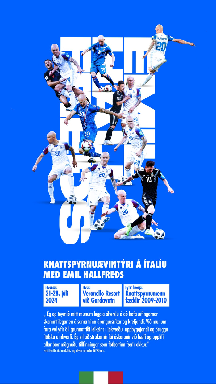 Eins og kunnugt er hefur Emil nú lagt skóna á hilluna en hann á að baki farsælan landslið og atvinnumannaferil sem telur nú tuttugu ár. Ævintýrið heldur þó áfram og er yfirskriftin á verkefninu “ Knattspyrnuævintýri á Ítalíu með Emil Hallfreðs” og er ætlað 13-15 ára knattspyrnumönnum ( fæddum árin 2009-2010).