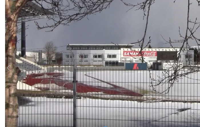Nú er hinsvegar snjóþekja yfir vellinum. Veðurspáin segir að hitastigið verði í kringum frostmark í kvöld og einhver snjókoma, þegar leikurinn hefði átt að vera spilaður.