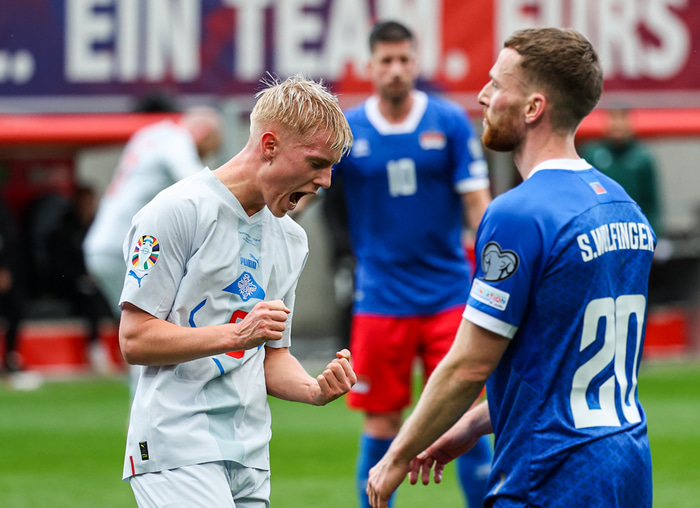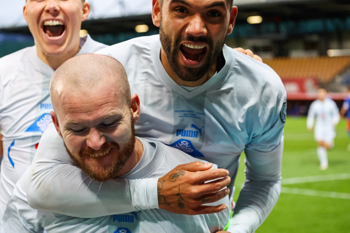 Hákon Arnar Haraldsson gerði fyrsta mark sitt á 38. mínútu og aftur var það Aron sem kom að því. Hann kom með glæsilega fyrirgjöf inn í teiginn á Hákon, sem lagði boltann fyrir sig áður en hann lagði boltann í hægra hornið. Hákon skoraði annað mark stuttu síðar með góðu skoti en hann, eins og Alfreð, var dæmdur brotlegur í aðdragandanum.