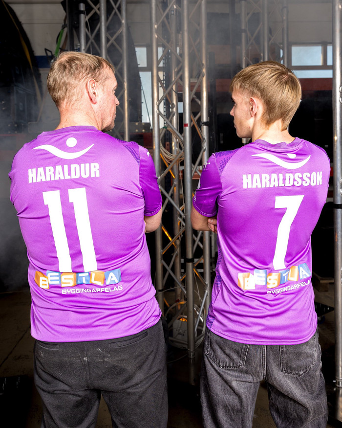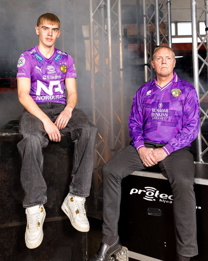 Búningurinn var líka fjólublár 1996 og varð ÍA Íslandsmeistari það ár. Í liðinu þá var Haraldur Ingólfsson sem er faðir Hauks Andra Haraldssonar sem er í liðinu í dag. Þeir eru á myndunum hér við fréttirnar.