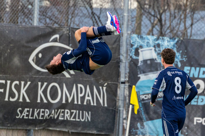 Davíð Helgi Aronsson skoraði sitt fyrsta mark í Bestu deildinni er Keflavík vann KA, 2-1, á Greifavellinum í kvöld. Hann fagnaði svo með skemmtilegum hætti og heldur því opnu að taka ný fögn í framtíðinni.