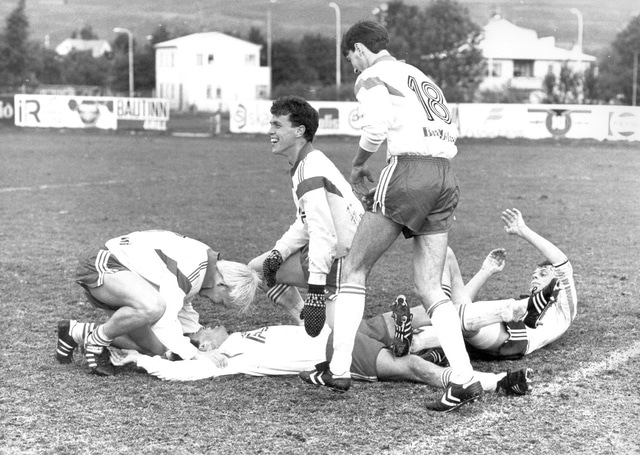 Í fótspor föður og frænda! Nökkvi Þeyr Þórisson, 19 ára Dalvíkingur, skoraði fyrsta sinni í efstu deild Íslandsmótsins í fótbolta í gær, þegar KA vann ÍBV 2:0 á Akureyri. Markið gerði Nökkvi Þeyr á 80. mínútu með vinstri fótar skoti rétt utan markteigs eftir góðan undirbúning Daníels Hafsteinssonar.