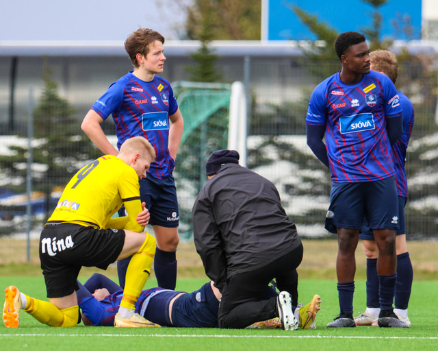„Hann fékk slink á hnéð og er farinn núna upp á bráðamóttöku. Hann var sárkvalinn og ég vona að hann jafni sig sem fyrst. Hann átti að fara núna í árshátíðarferð yfir helgina til Króatíu með fyrirtækinu sínu. Ég vona innilega að hann nái því. Við hugsum hlýtt til hans."
