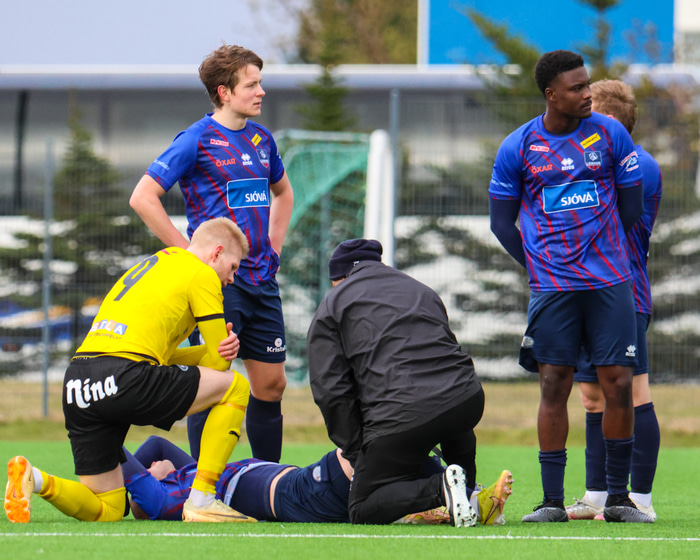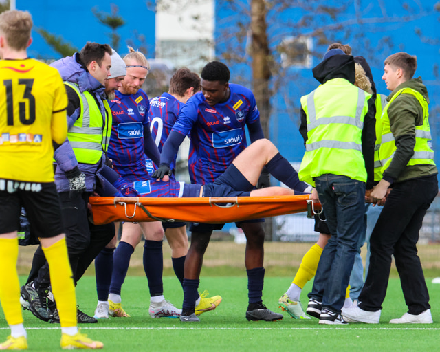 Sindri Björnsson, leikmaður Leiknis, meiddist illa í leik liðsins gegn ÍA í kvöld. Hann kom inn á í hálfleik en tæpum stundarfjórðungi síðar meiddist hann og voru börurnar kallaðar inn á Domusnovavöllinn.