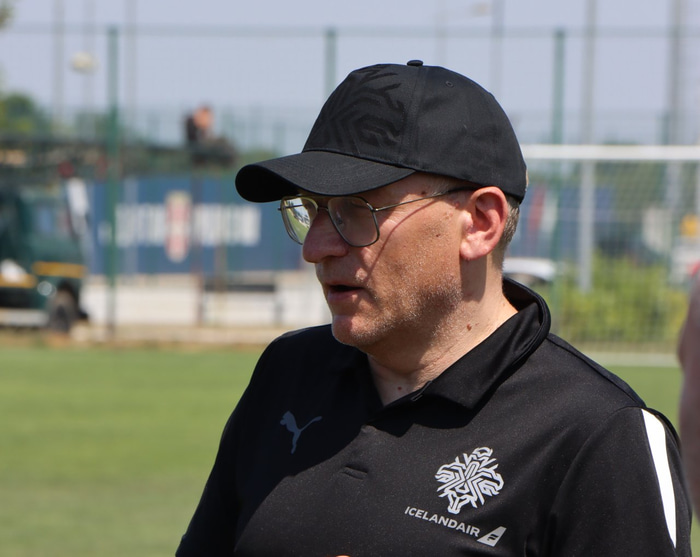 „Það er ekkert ferðalag á okkur og það hjálpar mikið. Við röltum af hótelinu og beint út á æfingasvæði. Það er mjög þægilegt. Ég horfi á keppnisvöllinn út úr herberginu mínu. Hann er svona 25 metrum frá herberginu mínu. Þetta er fín búbbla og það hentar okkur vel að vera hér í rólegheitum og vinna vel í okkar málum," segir landsliðsþjálfarinn.