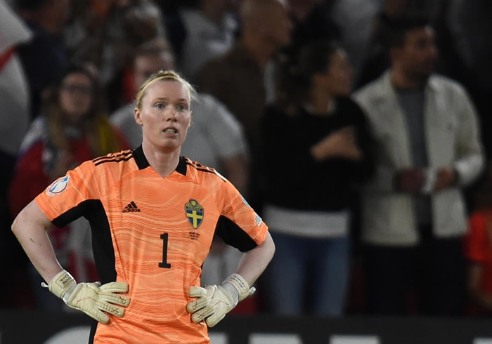 Fran Kirby rak svo síðasta naglann í kistu Svía. Hún lyfti boltanum upp í loftið og Lindahl sló hann aftur fyrir sig og í netið. Erfiður dagur á skrifstofunni hjá Lindahl.