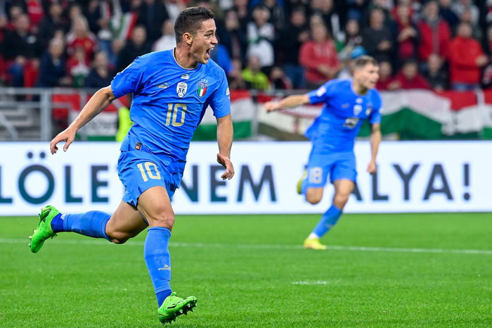 Ítalir mættu inn í leikinn af miklum krafti og sóttu á upphafsmínútunum en náðu ekki að koma boltanum í netið. Þegar leikurinn var búinn að róast niður kom fyrsta mark leiksins eftir slæm varnarmistök Ungverja. Giacomo Raspadori skoraði þá af stuttu færi eftir góða hápressu ásamt Wilfried Gnonto.