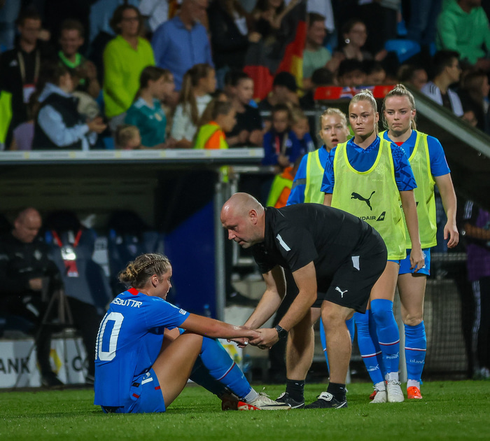 Karolína Lea var svekkt í leikslok og hér hughreystir Ásmundur Haraldsson aðstoðarlandsliðsþjálfari hana.