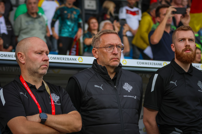 „Þetta var erfiður leikur, við kannski vorum aðeins of lin í návígjum og töpuðum of mikið af þeim til þess að geta flutt liðið eitthvað framar. Það lá svolítið á okkur því við náðum aldrei raunverulega að halda í boltann eða vera sterk á boltanum. Við mættum góðu lið og þær voru ógeðslega góðar í dag og bara börðu okkur út.“ Sagði Þorsteinn Halldórsson kallaður Steini þjálfari kvennalandsliðs Íslands sem mátti þola 4-0 skell gegn Þýskalandi í Þjóðardeildinni í Bochum fyrr í kvöld,