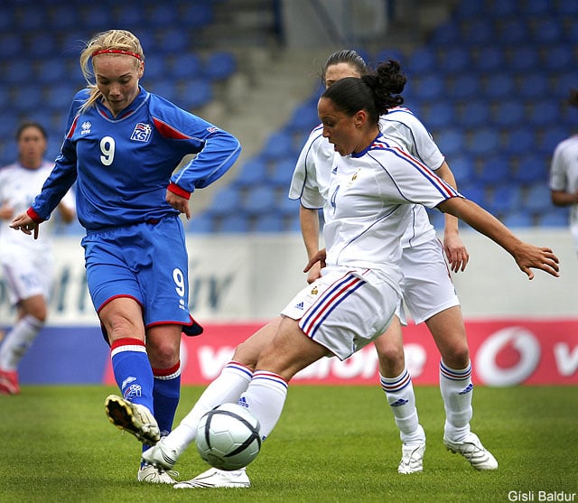 Í landsleik gegn Frökkum á Laugardalsvelli.