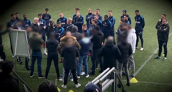 Reiðir stuðningsmenn fóru inn á æfingasvæðið með töflu og héldu taktískan fund fyrir liðið þar sem farið var yfir mistök liðsins í síðustu leikjum.