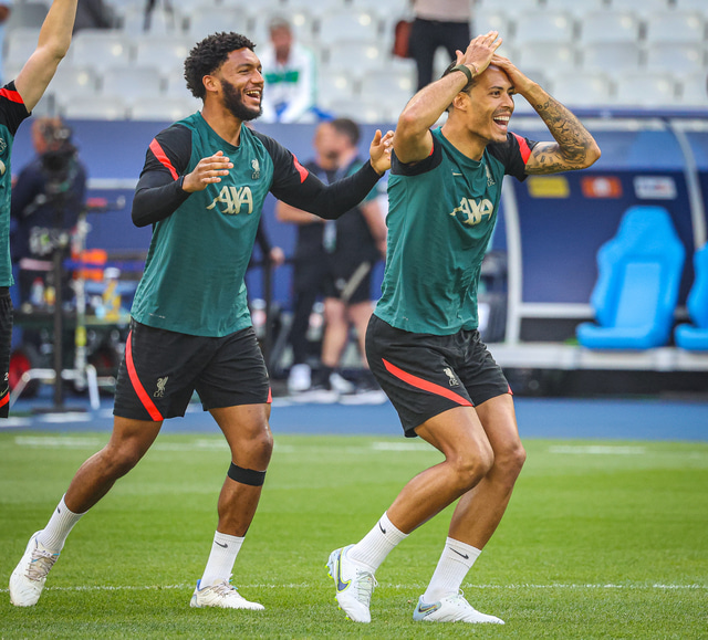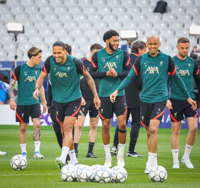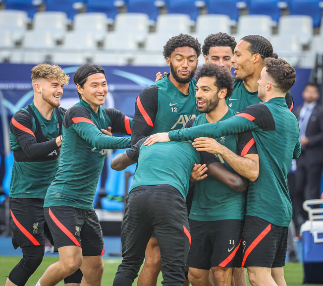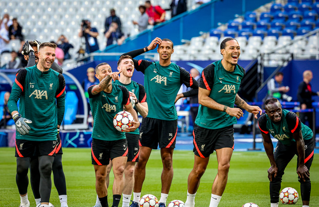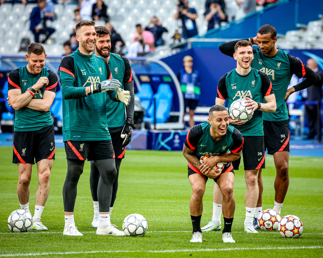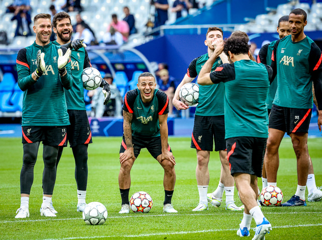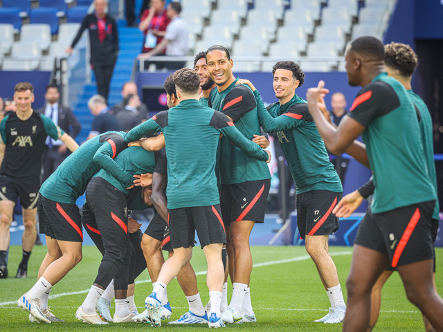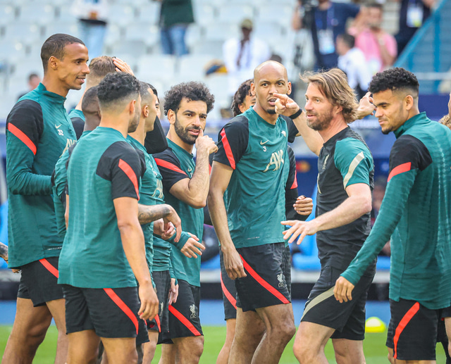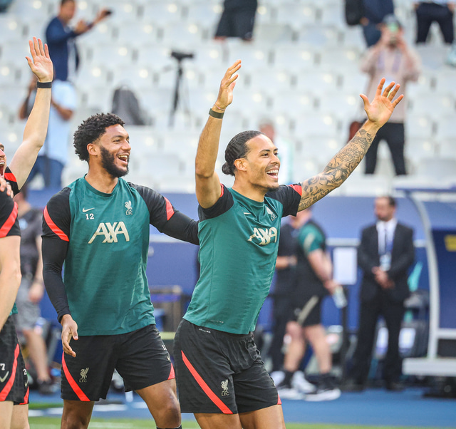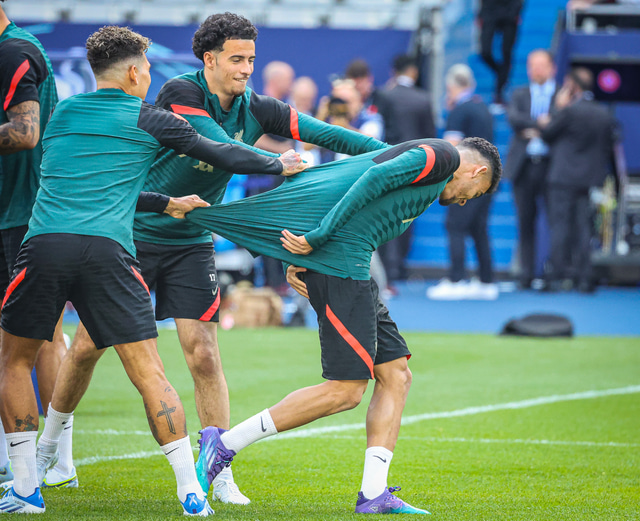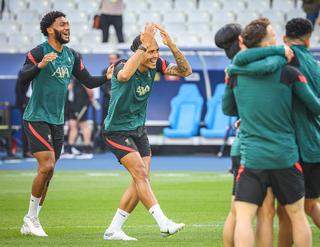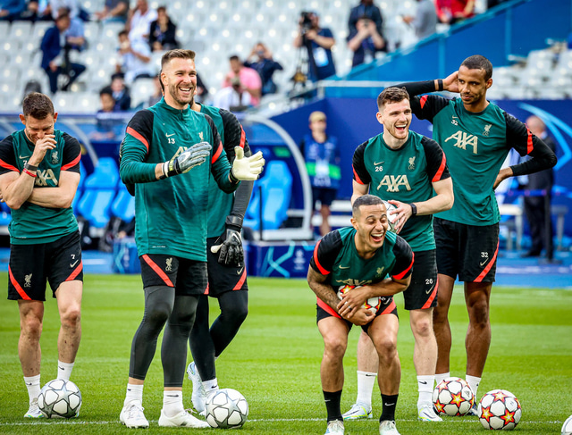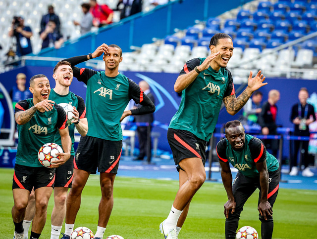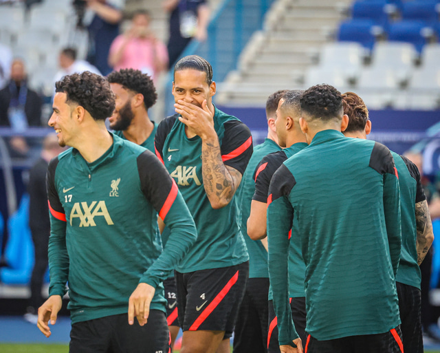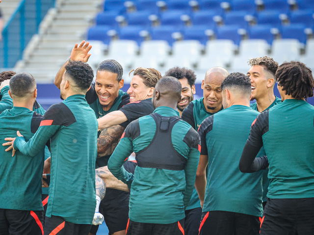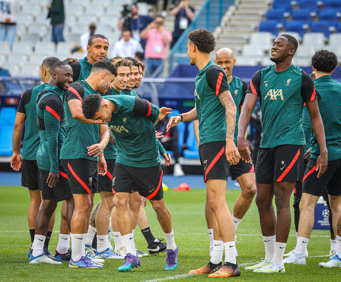 Það var heldur betur létt yfir Liverpool liðinu þegar þeir æfðu á Stade de France í París seinnipartinn í dag.