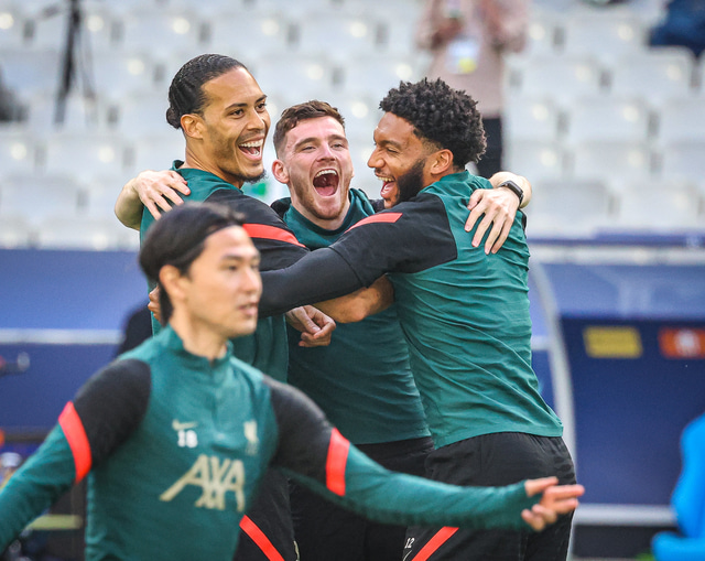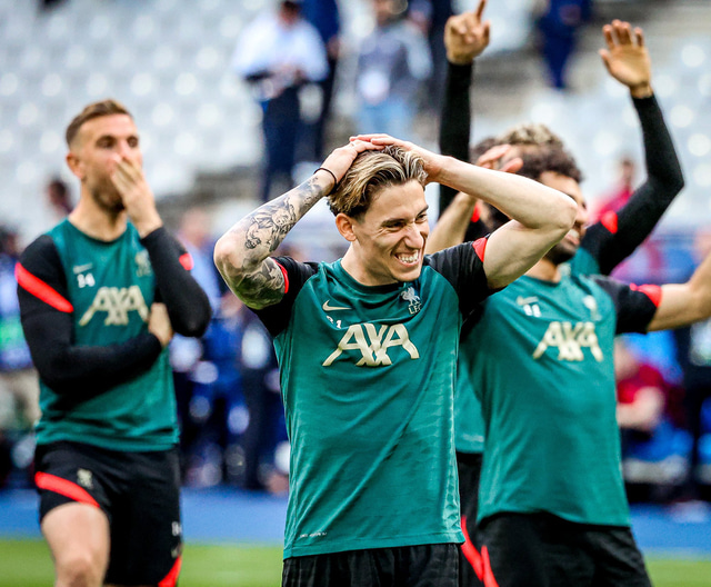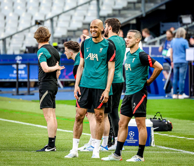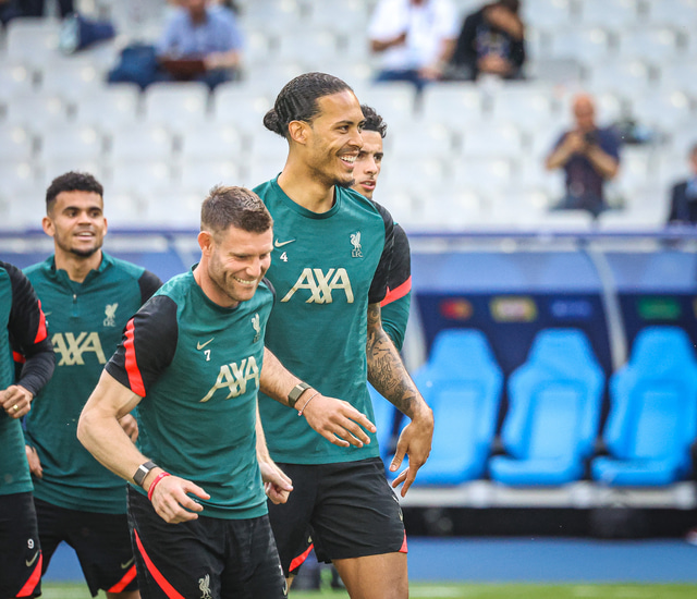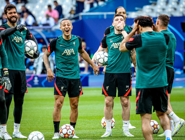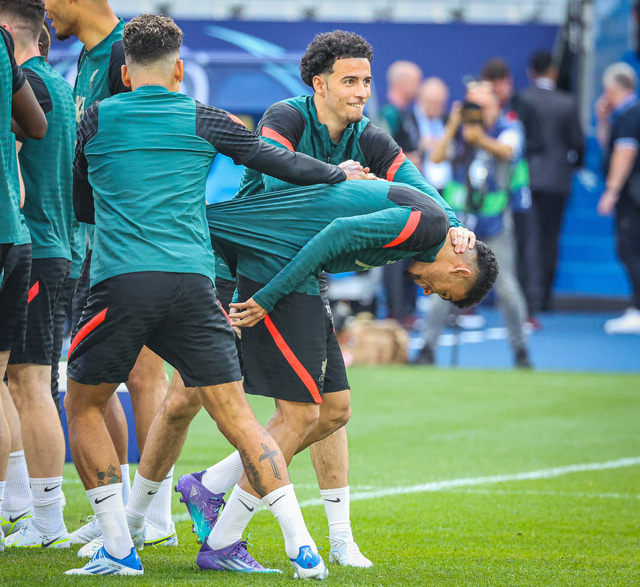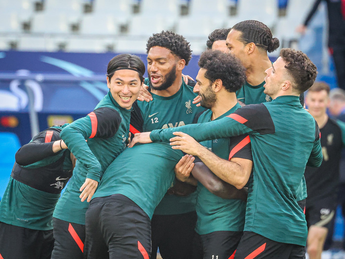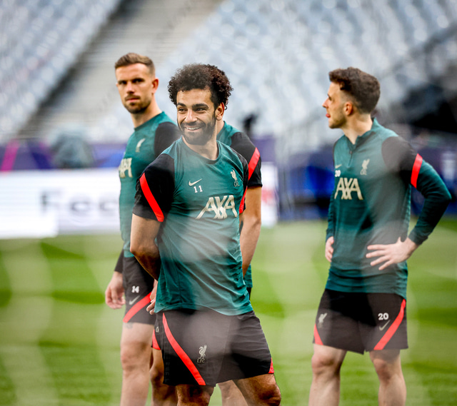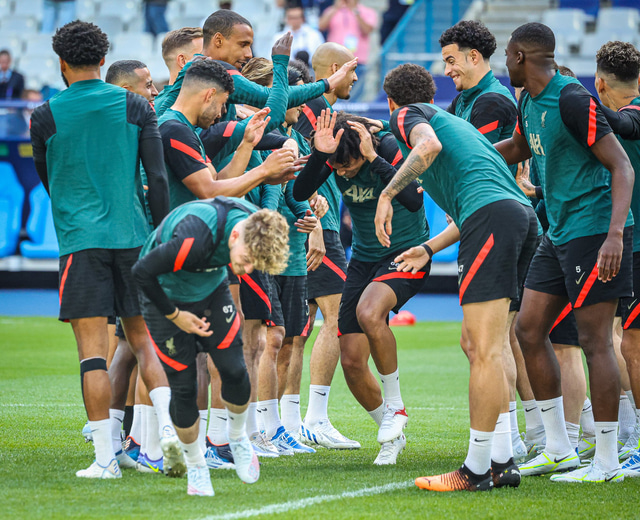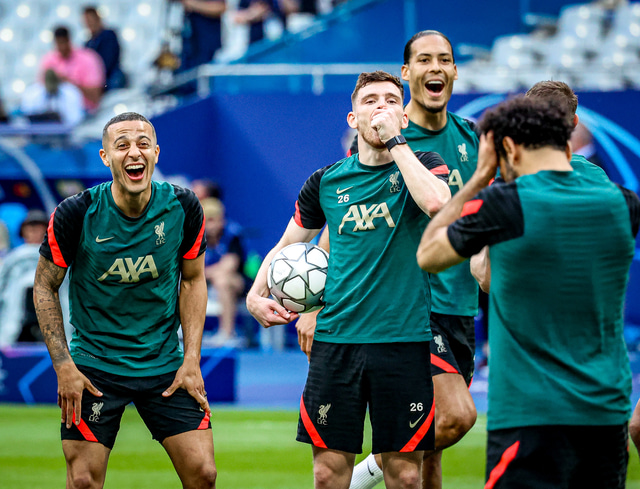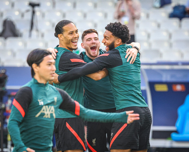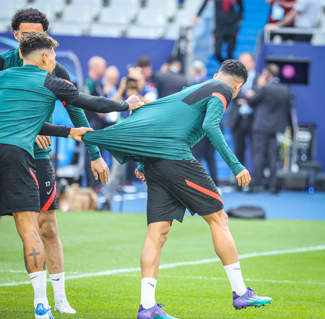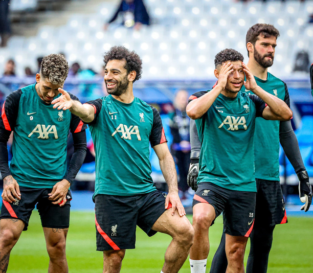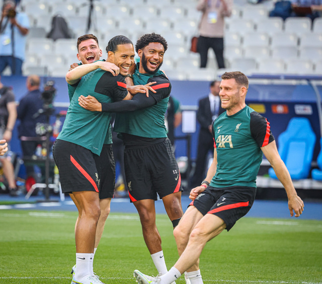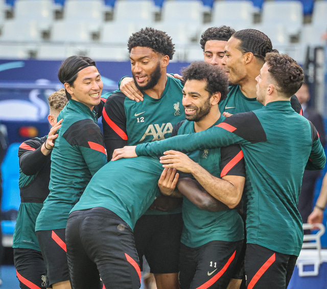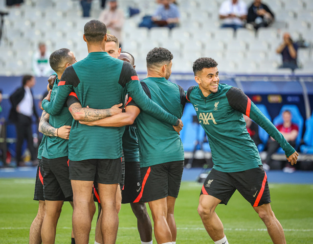 Það var heldur betur létt yfir Liverpool liðinu þegar þeir æfðu á Stade de France í París seinnipartinn í dag.