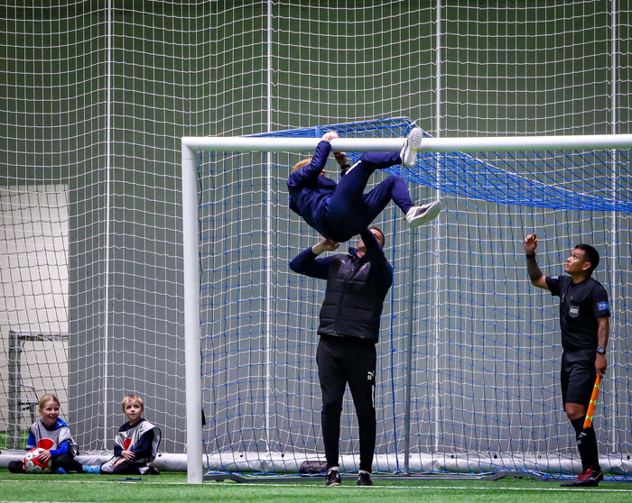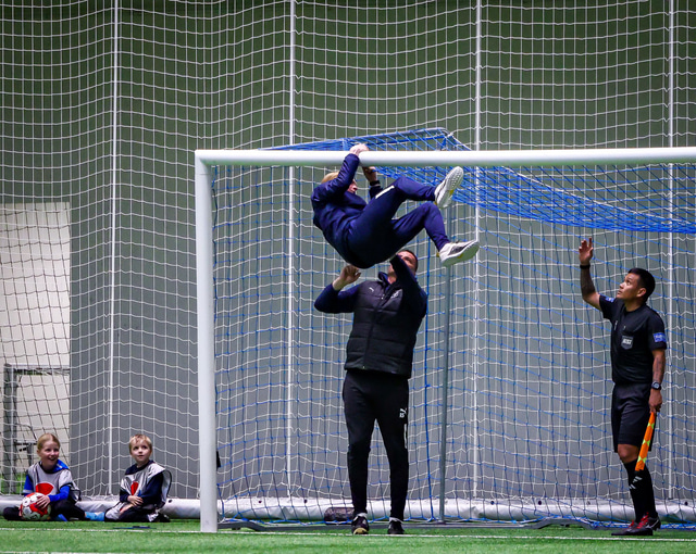 Vignir Snær Stefánsson aðstoðarþjálfari Stjörnunnar er ótrúlega lipur og klifraði upp í markið eins og klifurköttur og lagaði málið á nokkrum sekúndum. Aðfarirnar má sjá á myndinni sem fylgir fréttinni.