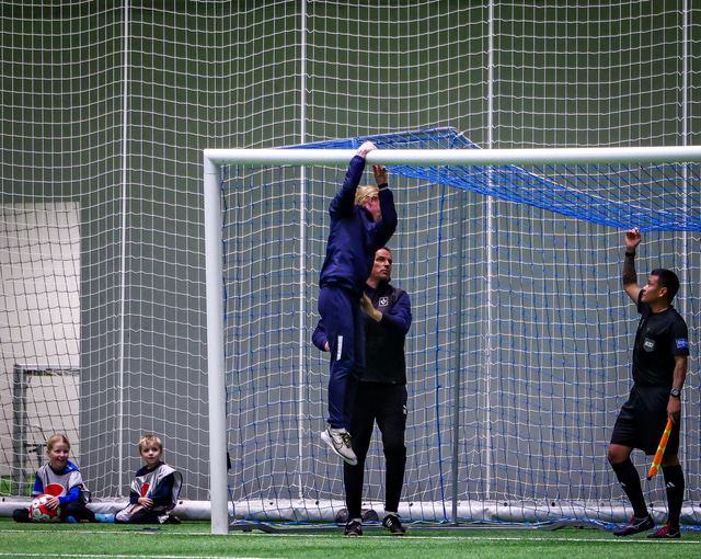 Þarna hefðu einhverjir búist við að töfin gæti orðið nokkur meðan leitað yrði að stiga og vallarstarfsmanni til að laga markið en það var þó ekki.