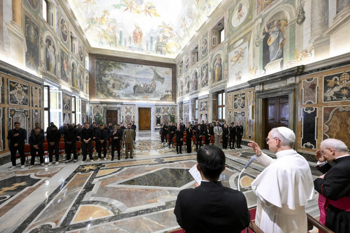 Páfinn hélt stutta ræðu þar sem hann talaði um mikilvægi liðsheildarinnar og óskaði Napoli til hamingju með titilinn. Leikmenn tóku í höndina á páfanum, þar á meðal Scott McTominay sem kom til Napoli frá Manchester United síðasta sumar og var einn besti leikmaður ítölsku deildarinnar.