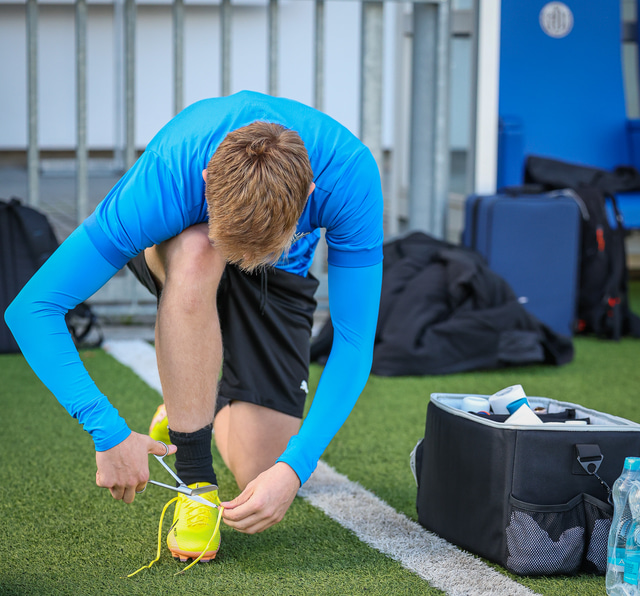 Eitthvað virðist það hafa farið í taugarnar á honum hvað reimarnar á nýju skónum voru langar því hann var ekki tilbúinn að hefja æfingu fyrr en hann leysti það vandamál.