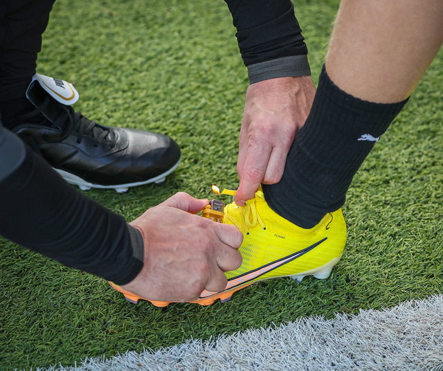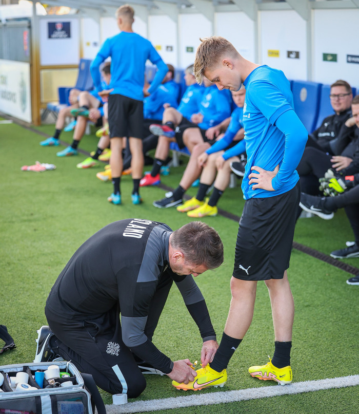 Eftir að hafa stolist í sjúkraþjálfaratöskuna og sótt sér skæri þar sem hann stytti reimarnar og fékk svo Trausta Sigurberg Hrafnsson sjúkraþjálfara til að kveikja eld til að loka endunum. Myndir af þessu má sjá að neðan.
