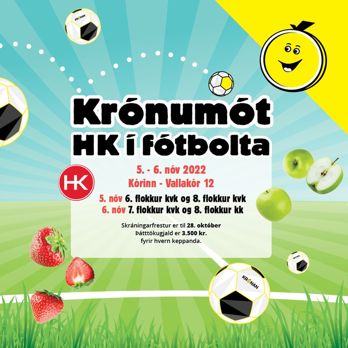 Krónumót HK í fótbolta verður haldið í Kórnum helgarnar 5. - 6. nóvember og 12. - 13. nóvember.
