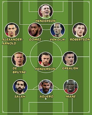 Tveir leikmenn Liverpool voru ofarlega á blaði en komust ekki inn. Sá fyrri var Alisson en sá seinni var Fabinho. Jordan Henderson er á miðjunni ásamt Kevin de Bruyne og Jack Grealish.