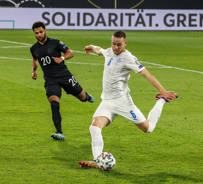 Úr leik Íslands og Þýskalands á dögunum. Gnabry, markaskorarinn í kvöld, pressar hér á Sverri Inga Ingason.