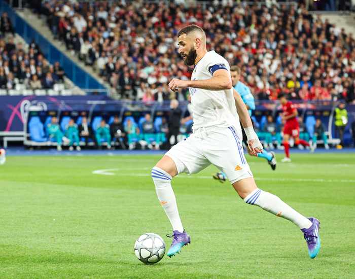 Leikmaður Real Madrid sparkar í boltann en hann fer síðast af Fabinho, miðjumanni Liverpool, áður en hann fer til Benzema.