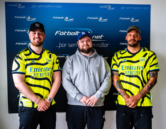 Gunnar og Jón Kári komu við á skrifstofu Fótbolta.net í gær og innheimtu skuldina en Stefán stóð auðvitað við stóru orðin og færði þeim báðum treyju merkta Havertz. Þeir kusu báðir að fá varabúning Arsenal og tóku þeir sig vel út í honum.