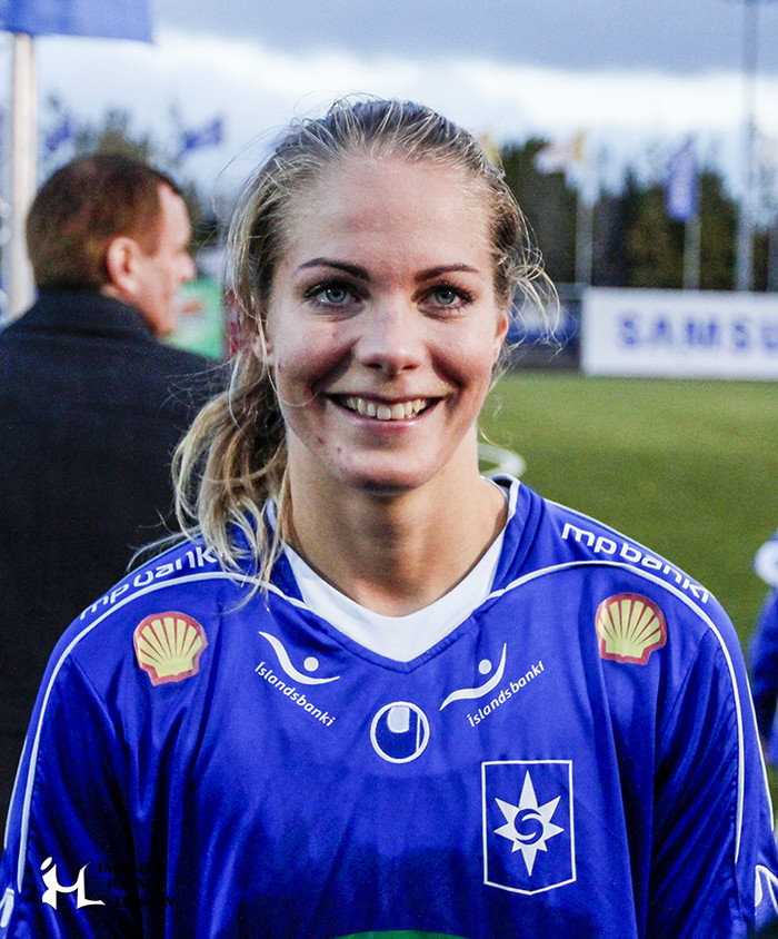 Það lá vel á Hörpu Þorsteinsdóttur leikmanni Stjörnunnar eftir sigur gegn Selfossi í kvöld. Harpa skoraði tvö mörk í leiknum og var valin maður leiksins.