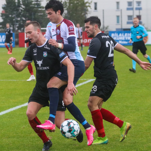 Þannig fór leikurinn í gang en erfitt var að sjá mun á liðunum og sér í lagi í sjónvarpsútsendingu á Stöð 2 Sport en leikið var í mikilli rigningu sem gerði búningana enn dekkri.