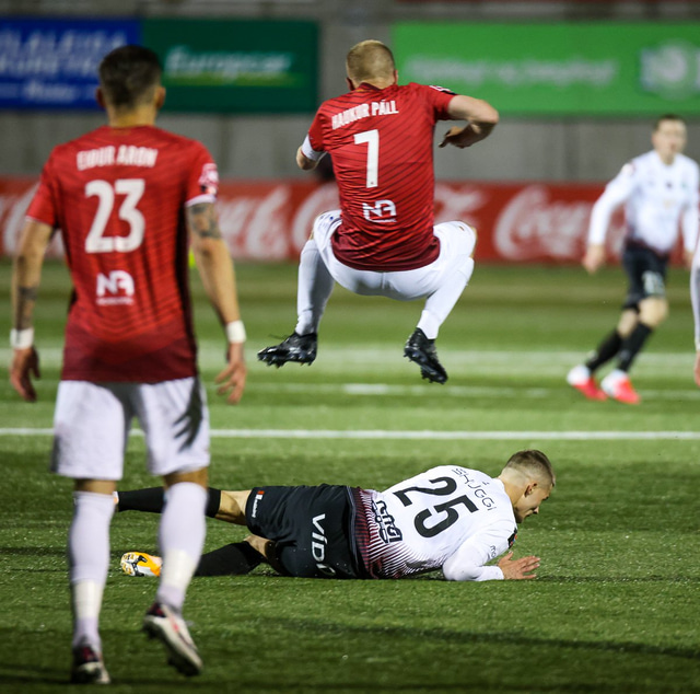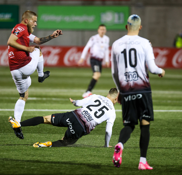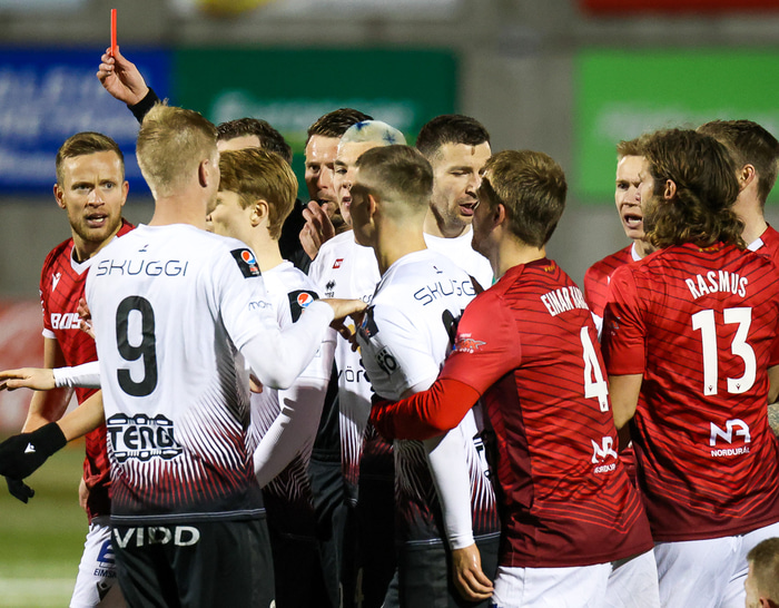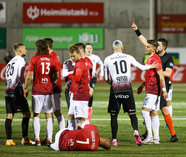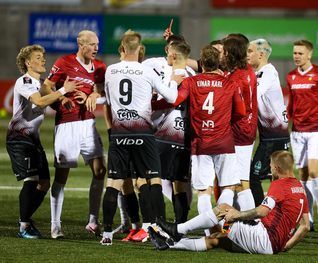 Leikmenn Vals brjáluðust og veittust að Davíð eftir tæklinguna og í þann mund sem hann fékk að líta rauða spjaldið.