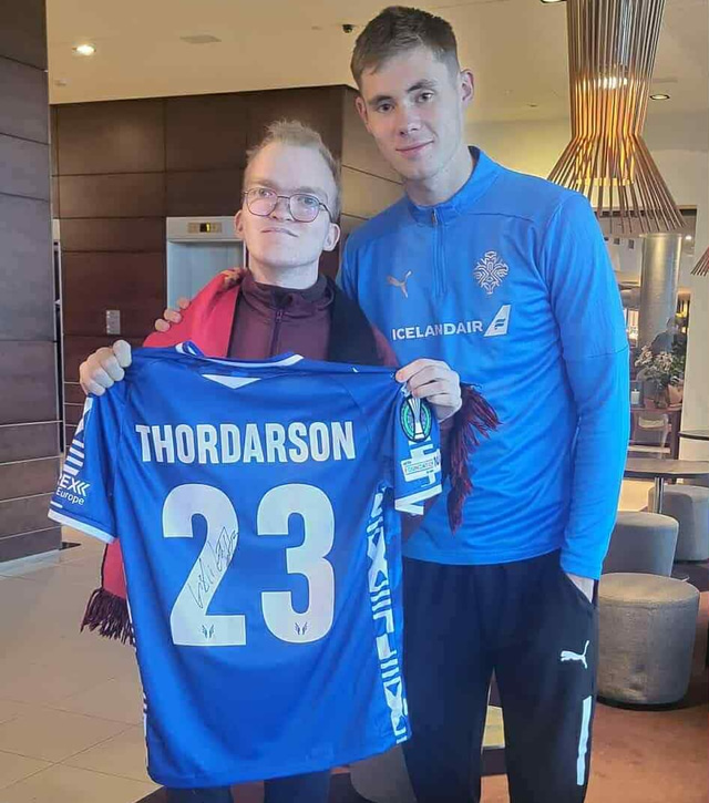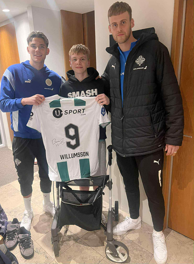 Landsliðsmennirnir Brynjólfur Willumsson og Elías Rafn Ólafsson ásamt Magnúsi Mána - 15 ára - sem missti skyndilega allan mátt fyrir neðan bringu eftir alvarleg veikindi árið 2023.