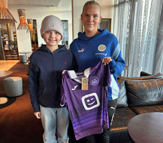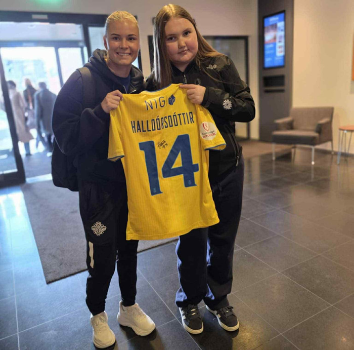 Hafrún Rakel Halldórsdóttir leikmaður Brøndby ásamt Elísabetu Ásu sem greindist með Acnes taugasjúkdóminn árið 2024. Hún er ein af fáum í heiminum sem bera þessa tegund af sjúkdómnum. Málefni: Einstök Börn