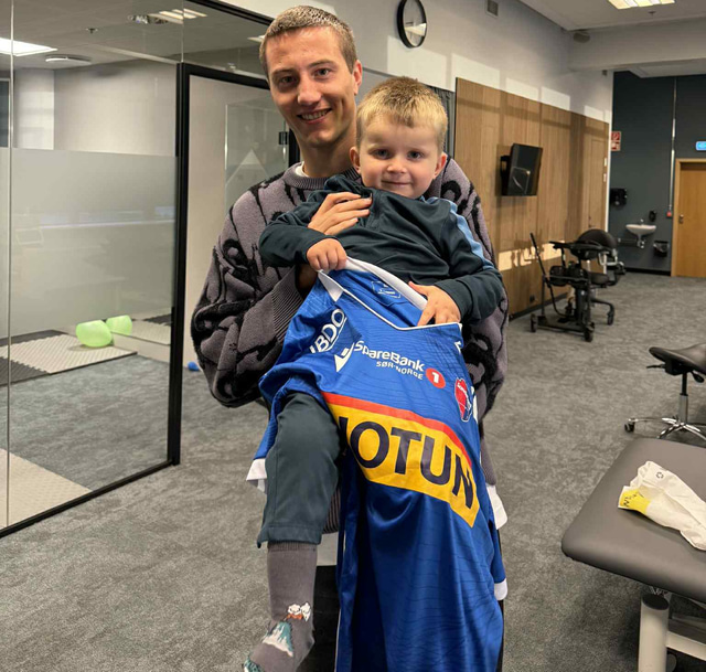 Stefán Ingi Sigurðarson, leikmaður Sandefjord, ásamt Henrik Heiki - 3 ára - sem greindur er með SMA týpu 2. Málefni: fsma.is