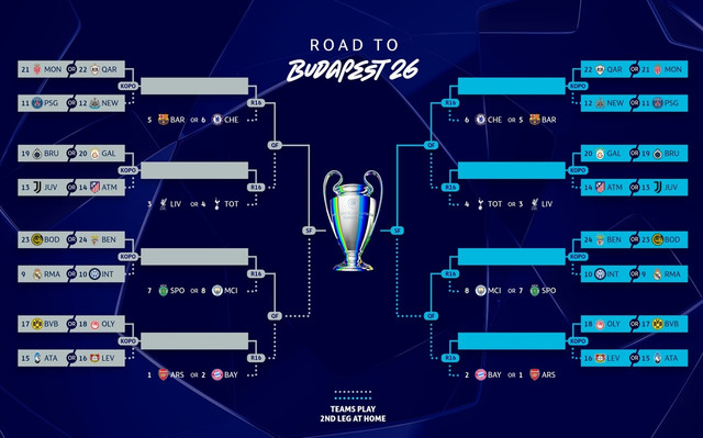 Hvert lið á möguleika á tveimur mótherjum. Liðin sem enduðu í 9. og 10. sæti (Real Madrid og Inter) geta semsagt mætt liðunum sem enduðu í 23. og 24. sæti (Bodö/Glimt eða Benfica).
