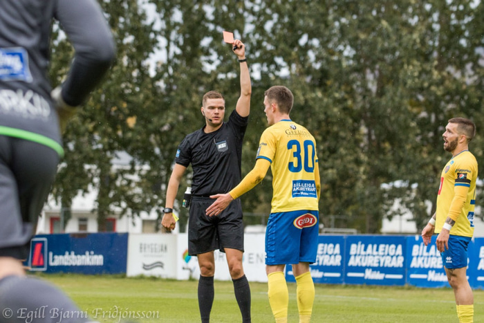 Sveinn fékk að líta tvö gul spjöld gegn Fylki á Akureyrarvelli síðasta sumar. Það seinna fyrir meintan leikaraskap. Sveinn var beðinn um að fara yfir rauða spjaldið sem hann fékk.