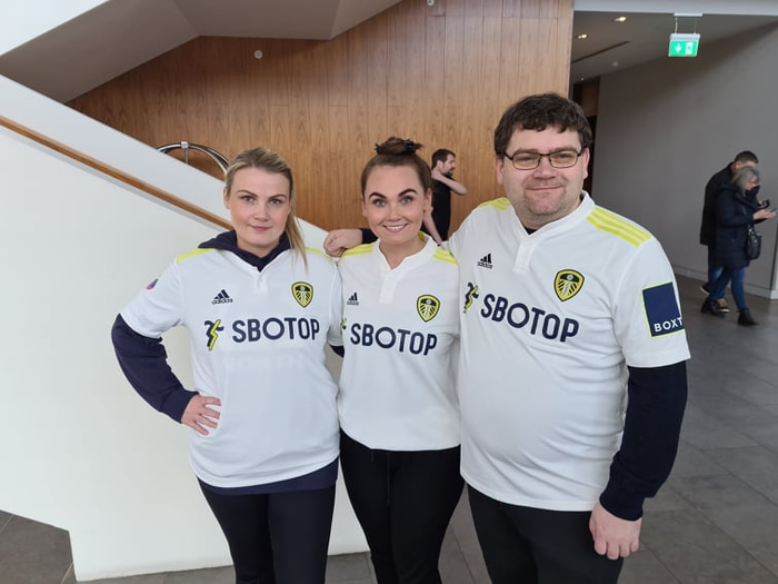 Árni Þór, stuðningsmaður Leeds, ásamt systrum sínum. Fimm mínútum fyrir þessa mynd voru þær í lyftu með Luke Ayling á hótelinu og þær höfðu ekki hugmynd um hver hann var.