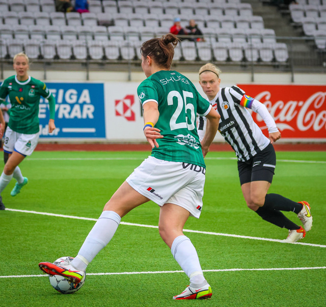Í sigri Breiðabliks á KR í gærkvöldi var hún búin að bæta um betur í stuðningi sínum við samlanda sína því hún var búin að setja fána þjóðarinnar á úlnliðinn eins og sjá má á meðfylgjandi myndum.