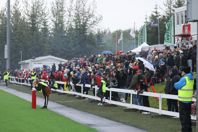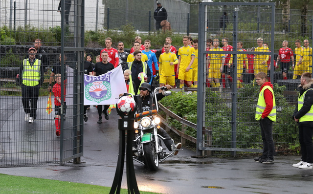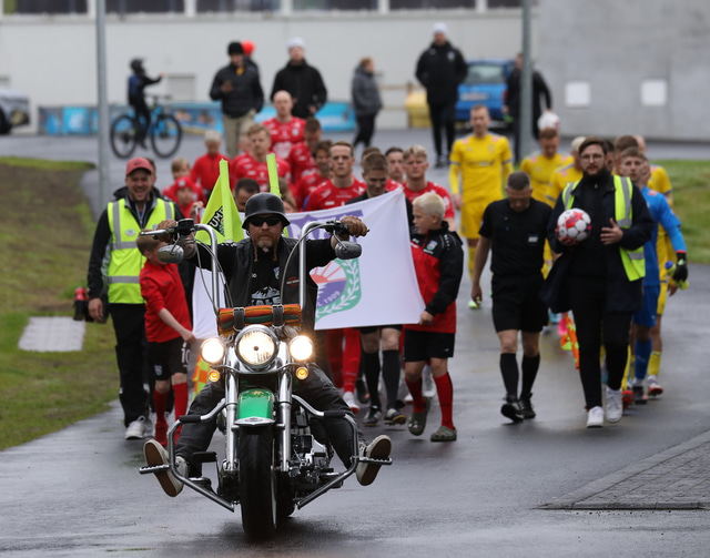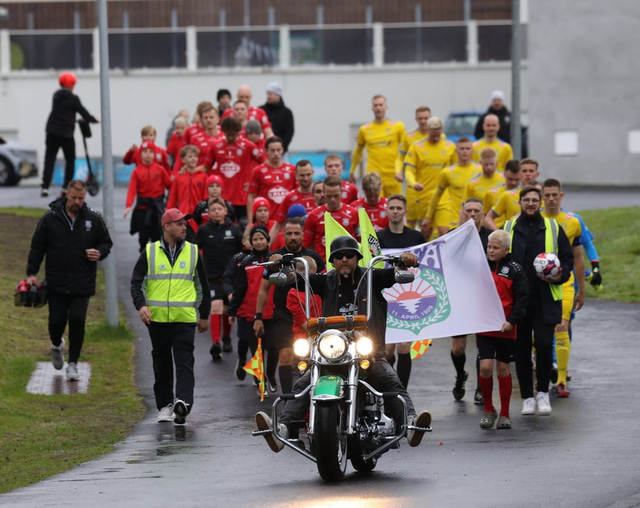 Afturelding vann 3 - 2 sigur á Fjölni í toppslag Lengjudeildar karla í gærkvöldi en þar mátti sjá Harley Davidson mótorhjól fylgja liðunum inn á völlinn auk þess sem boðið var upp á nudd. Raggi Óla fangaði stemmninguna á mynd.