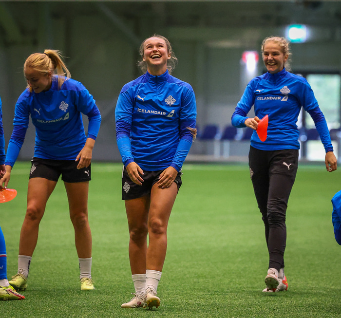 „Það er alltaf gaman að koma í landsliðið og hitta stelpurnar," segir Alexandra Jóhannsdóttir, miðjumaður landsliðsins, fyrir æfingu liðsins í Miðgarði í dag.