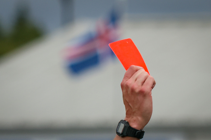 Hann fékk rautt fyrir að brjóta af sér sem aftasti varnarmaður eftir að hafa misst boltann afar klaufalega frá sér og hleypt gestunum í skyndisókn.