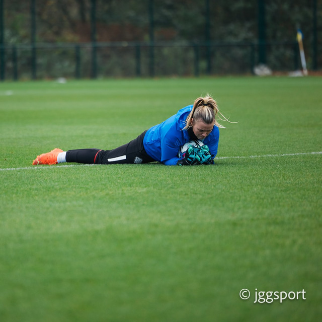 Ingibjörg handsamar boltann á æfingu í morgun. Fleiri myndir sem Jónína Guðbjörg Guðbjartsdóttir tók af töktum hennar má sjá neðar í fréttinni.