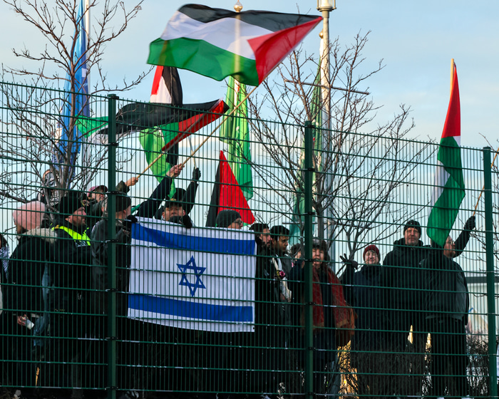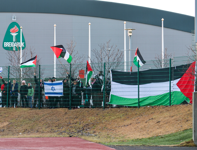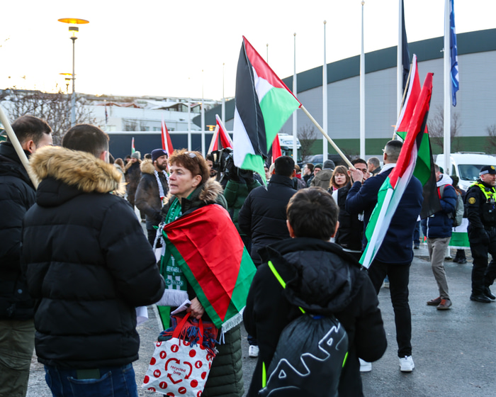 Einnig er mættur hópur sem sýnir Ísrael stuðning og nokkrir mættir með þjóðfána Ísraels fyrir utan leikvanginn. Fjölmennt lið lögreglu er á staðnum og mikill viðbúnaður en yfirlögregluþjónn sagði við RÚV að leikurinn hefði verið áhættumetinn hátt.