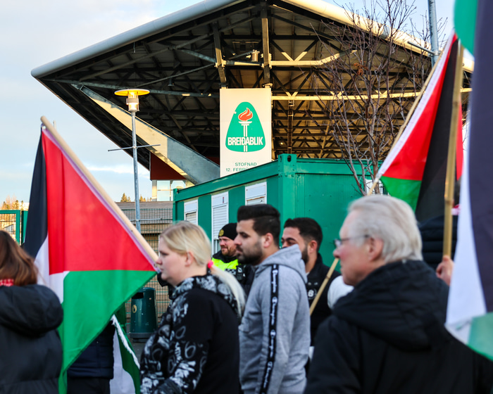 Stór palestínskur fáni hefur verið settur upp á áberandi stað við girðinguna við völlinn svo hann sést mjög vel í sjónvarpsútsendingunni frá leiknum. Gæslan er fljót að gera þá palestínsku fána sem eru innan girðingar upptæka.