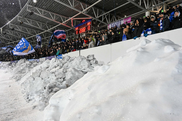 Helsinki var að vinna leikinn 2-1 áður en stuðningsmenn skoska liðsins tóku upp á því að hnoða snjóbolta og kasta í Niki Maenpaa, markvörð Helsinki.