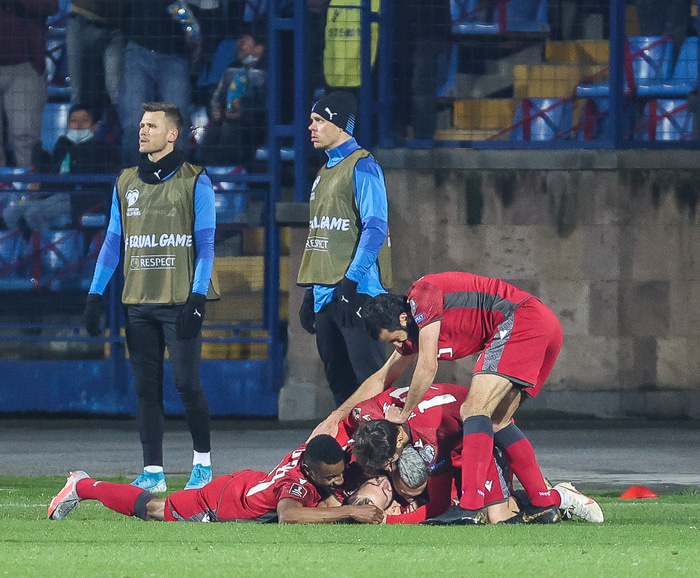 Ísland er án stiga en mætir Liechtenstein klukkan 18:45. Hægt er að fara í beina textalýsingu frá þeim leik hérna.