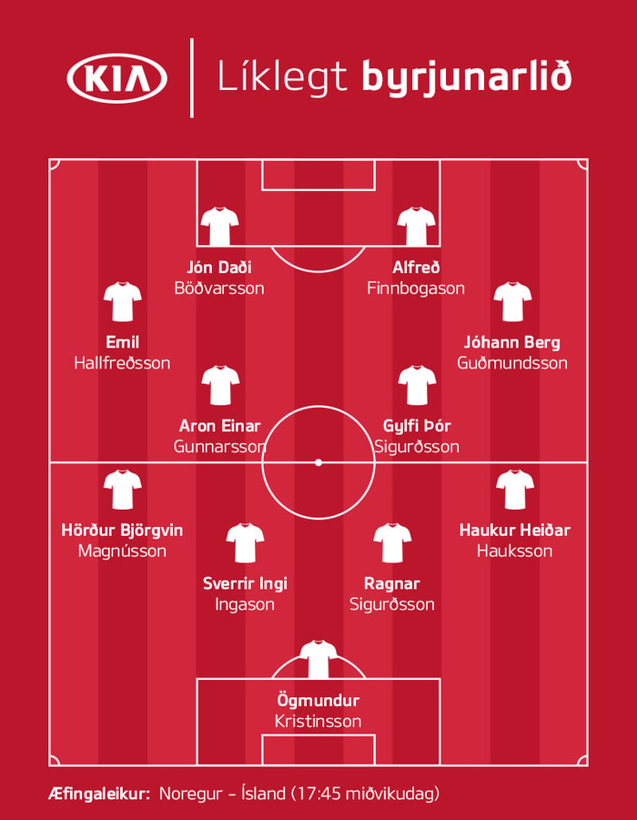 Ísland á tvo undirbúningsleiki framundan fyrir EM, sá fyrri verður gegn Noregi á Ullevaal á morgun. Staða leikmanna er mismunandi fyrir leikinn eins og Heimir nefnir en teymi Fótbolta.net hér í Noregi býst við að svona verði byrjunarliðið á morgun (4-4-2 auðvitað!).